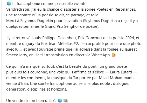 À Poètes en Résonances, la poésie a dessiné un bel espace de transmission entre voix confirmées, jeunes talents et dialogue des cultures.