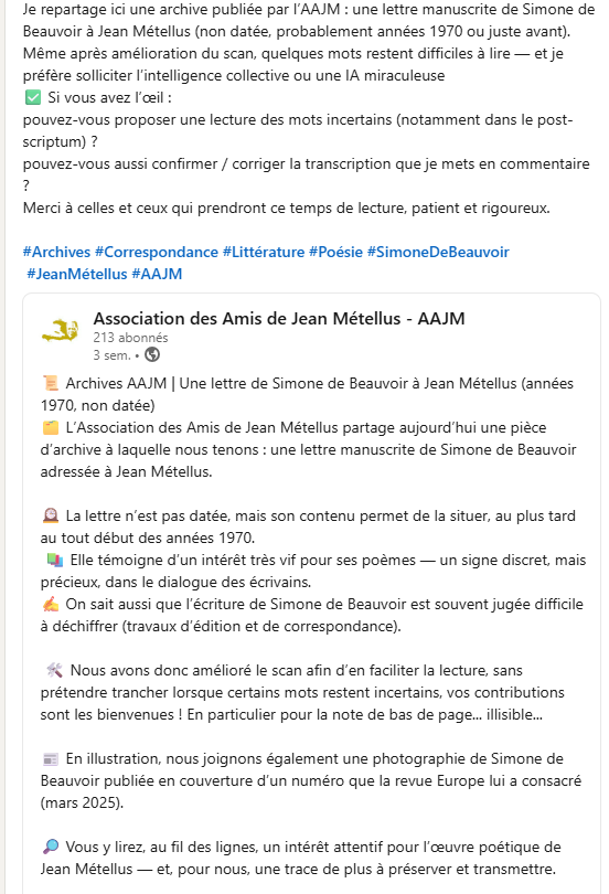 Faire lire, relire, confronter les regards : autour d’une lettre de Simone de Beauvoir à Jean Métellus, une belle expérience d’intelligence collective au service des archives.