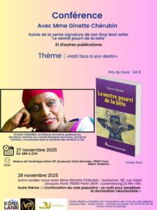 À la demande de Ginette Chérubin, coordination d’un passage à Paris et en Europe autour de son livre Haïti, le ventre pourri de la bête.